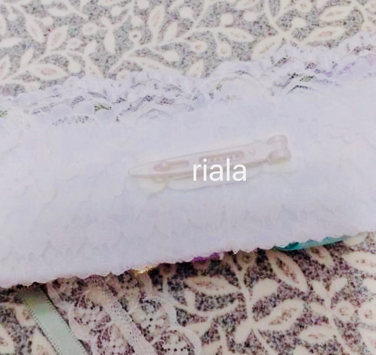 顎下で結むカ所もレースを使いましたので華やかです。サイドの揺れるオーガンジーの花が優しい感じです。