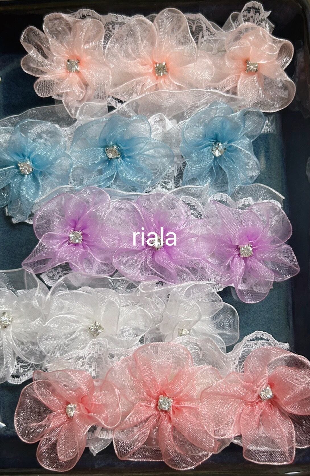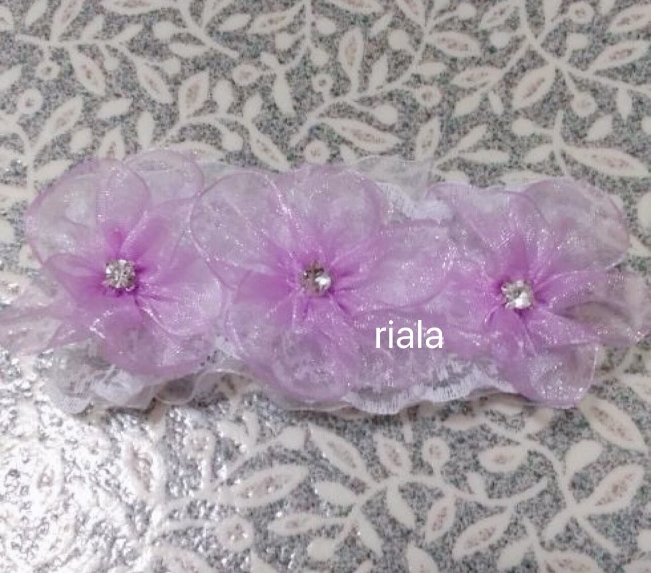 レースの上に手作りのオーガンジーのお花を3つ乗せました。